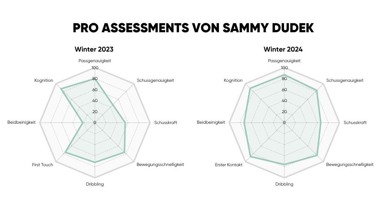 Das Netzdiagramm im ProAssessment-Report zeigt auf einen Blick, wo ein Spieler seine Stärken hat und wo Entwicklungspotenzial liegt. Je weiter eine Linie nach außen reicht, desto stärker das Leistungsvermögen. Zwischen Winter 2023 und Winter 2024 verbesserte Sammy seinen Wert im Bereich Erster Kontakt um 70 % und sein Ergebnis im Bereich Beidbeinigkeit sogar um über 230 %. Seine Beidbeidbeinigkeit – eine zentraler Faktor im Spiel als zentraler Mittelfeldakteur – erreichte damit innerhalb eines Jahres das Niveau der ersten Mannschaft.